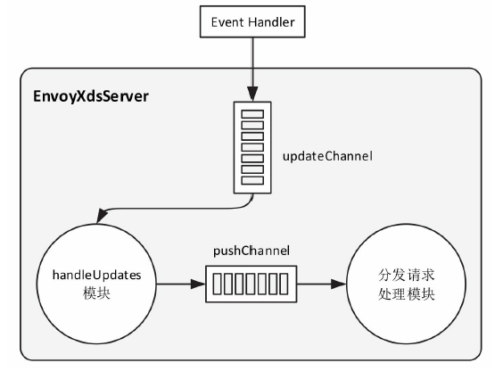 - 从GRPC连接中接收来自Envoy的xDS 请求,并放到一个channel reqChannel中
