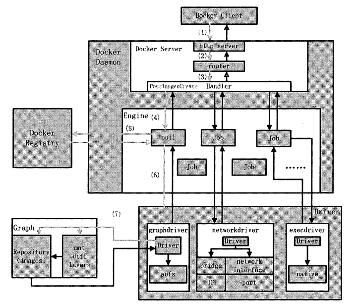 - 若用户需要下载容器镜像,DockerDaemon则会创建一个名为“pull”的Job,运行时从Docker Registry中下载镜像,并通过镜像管理驱动graphdriver将下载的镜像存储在graph中