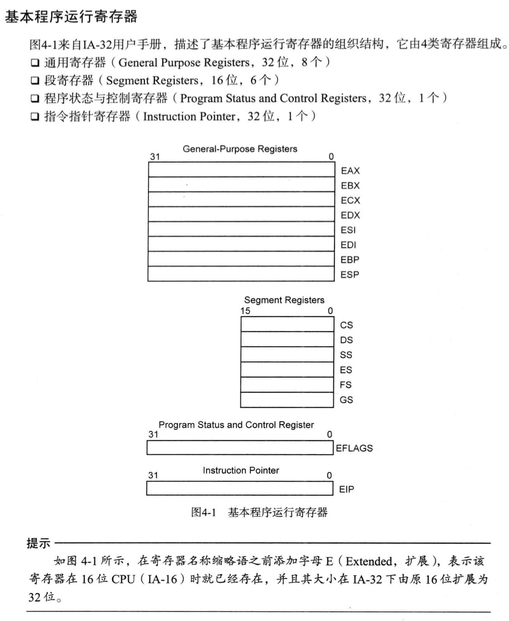 以上寄存器列表中,学习基本程序运行寄存器的相关内容,程序调试中最常见的寄存器,后期学习有关控制寄存器、内存管理寄存器、调试寄存器知识