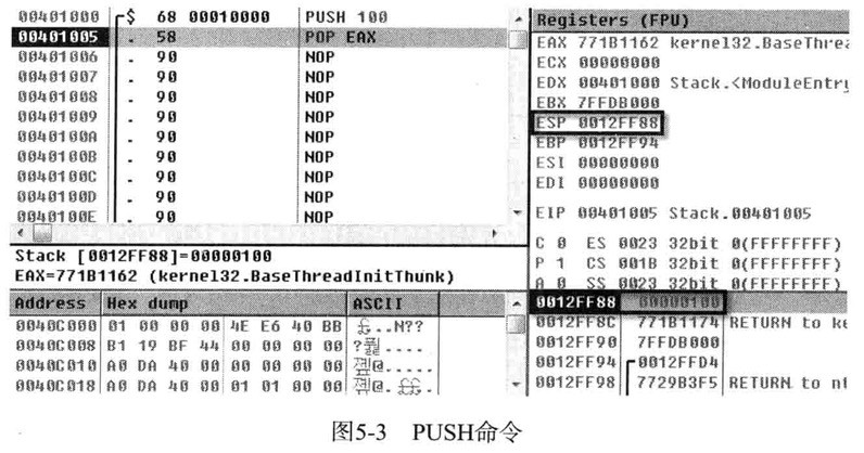 换言之,从栈中弹出数据后,ESP随之向下移动,向栈压入数据与从栈弹出数据,栈顶指针的变化情形归纳如下