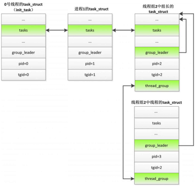 线程的成员group_leader指向组长的进程描述符,成员tgid是线程组标识符,成员pid存放自己的进程标识符。