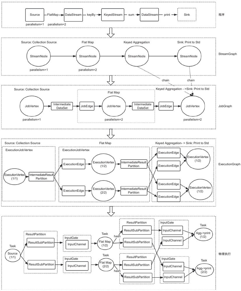 那么StreamExecutionEnvironment中保存的Transformation用来做什么呢?实际上Flink根据这些Transformation生成整个运行的拓扑,整个生成过程大致如下: